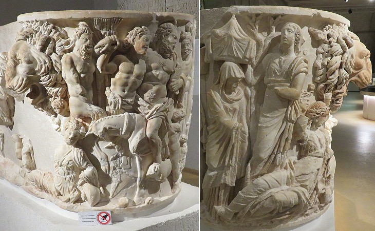 Sarcophagus of Bacchus in India: (left) one of the short sides showing a satyr and a maenad, a female follower of Bacchus; (right) detail of the main relief portraying Indian prisoners in the same way as Moor cavalrymen were depicted on Trajan's Column in Rome