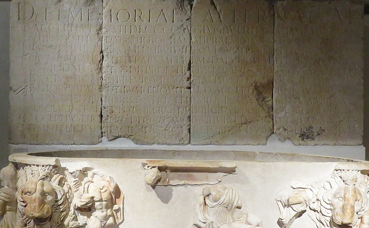 In 1870 a mausoleum was found in the outskirts of Lyon along the road which led to Vienne. It contained a long dedicatory inscription to a boy of eleven; his parents grieved also the loss of two other children. The inscription ends with the words sub ascia dedicavit which is peculiar of the Lyon region where it was found in more than 400 cases (see another inscription). Ascia is a small axe and it was also often carved on sarcophagi. The meaning of the sentence has been debated at length: according to the prevailing opinion it indicates total possession of the tomb and therefore it would be a sort of warning not to enter or damage it.