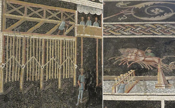 Circus Games Mosaic: (left) four of the eight "carceres" (starting boxes); (right) system for counting the number of laps