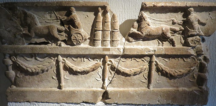 This fine relief was most likely part of a funerary monument. It might have belonged to a charioteer because we know that they could earn very well and therefore be in a position to pay for a fine tomb as did Publius Aelius Gutta Calpurnianus in Rome. The relief shows a race of bigae, two-horse chariots (as in a fresco at Ostia), although the more spectacular races were reserved to quadrigae, four-horse chariots. Archaeologists believe that the site of the circus of Lyon was located on the hill of Fourvière, but its remains have not yet been identified with certainty.