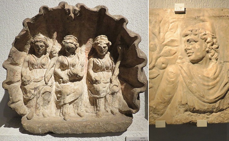 The number three had a particular significance in all ancient religions including that of the Gauls; in this relief the number is combined with the worship of fertility goddesses; that at the centre holds a baby, those at her side have a patera, i.e. a votive offering and a cornucopia, a symbol of plenty. Similar reliefs have been found in Britain near Cirencester and at Cologne, but the practice of votive offerings with reliefs/statues portraying mothers was widespread in the Ancient World (see the statues of Mater Matuta at Capua and a relief of Demeter, Kore and Hecate at Selinunte).