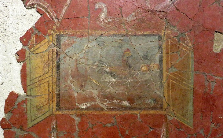 In general we have by far more Roman floor mosaics than frescoes, but the exceptional circumstances which froze in time Herculaneum and Pompeii have shown that the walls of the houses were usually painted. This fresco was reconstructed from tiny fragments of paint from a demolished wall by using a technique which was not available until recent years. Xenia were the gifts in food and drinks which were made to guests (Greek xenos meaning foreigner/guest). These gifts were depicted also in floor mosaics of reception rooms, e.g. at Sepphoris; a particular type of xenia floor mosaic decorated Horti Serviliani in Rome.