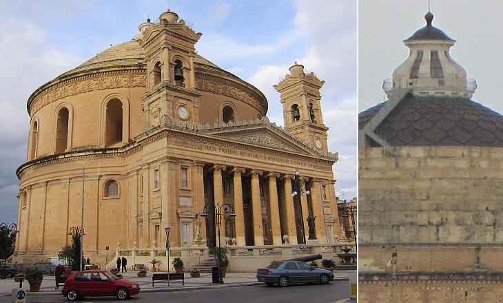 Mosta is another village which became a parish in the XVIIth century. Its church was designed by Tommaso Dingli, but it was pulled down in 1830 to make room for a gigantic building. In the intentions of George Grognet de Vasse, a Maltese architect of French origin, the new church should have resembled the Pantheon of Rome aka La Rotonda which at the time had two small bell towers. Current tourist guides indicate St. Mary's among the "must see" of Malta, but unless one is fascinated by size, the building hardly deserves such a high rating.