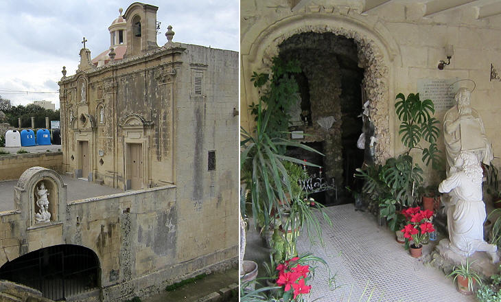 Mosta - Tal-Isperanza (Our Lady of Hope) and a detail of the modern chapel in the cave beneath the church