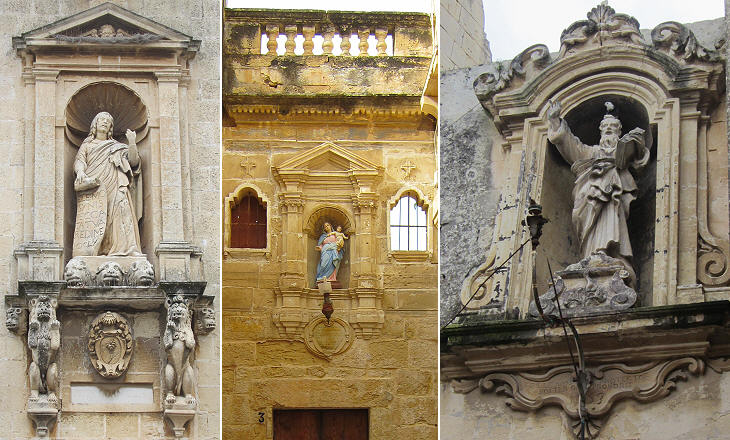 Modern statues in tabernacle frames at (from left to right) Birgu, Zebbug and Victoria