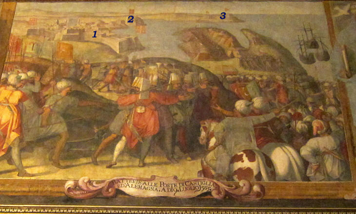 Fresco by Matteo Perez d'Aleccio in the Grand Masters Palace at Valletta showing the Ottomans in the process of laying siege to Borgo on July 9, 1565: 1) Castile Bastion; 2) Fort S. Angelo; 3) Fort S. Elmo