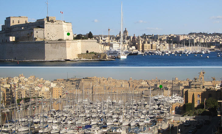 (above) Borgo/Vittoriosa seen from Valletta (green dot: Fort S. Angelo); (below) Porto delle Galere, the historical harbour of Borgo/Vittoriosa seen from Provence Bastion: (left) Senglea; (centre) Valletta; (right) Borgo/Vittoriosa (green dot: Fort S. Angelo)