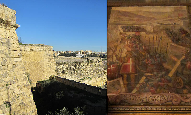 (left) Castile Bastion; (right) Fresco by Matteo Perez d'Aleccio in the Grand Masters Palace at Valletta showing the Knights defending the bastion on July 29. 1565