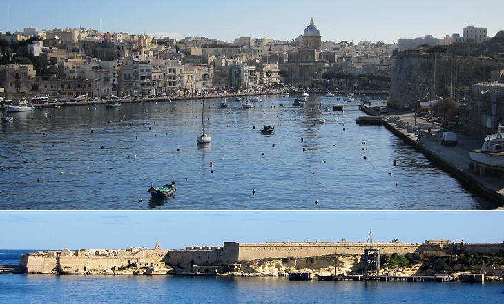 The natural harbour to the south of Valletta is divided into smaller inlets by peninsulas.