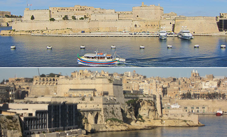 (above) Fort S. Angelo seen from Senglea; (below) Fort S. Angelo seen from Castile Bastion and in the background Valletta