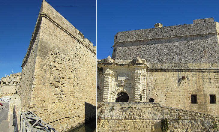 Fort S. Angelo: (left) eastern bastion; (right) portal built in 1690 by Grand Master Gregorio Carafa della Roccella; according to the inscription the fortress was built on the site of a Roman temple dedicated to Juno