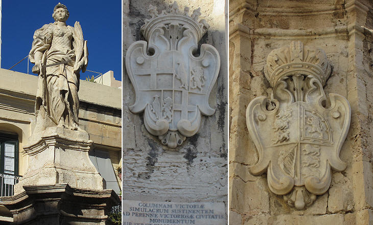 (left) Statue celebrating the 1565 victory; (centre) coat of arms of Grand Master Valette (not original); coat of arms of the United Kingdom (shown because it is very unusual to see it in such an Italian design)