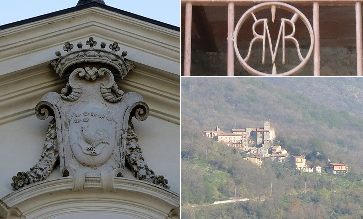 (left) S. Vincenzo Ferrer: coat of arms of the Del Gallo (It. gallo; Engl. cock); (right-above) MR, symbol of the Marquis of Roccagiovine, on a house; (right-below) Roccagiovine seen from Mandela