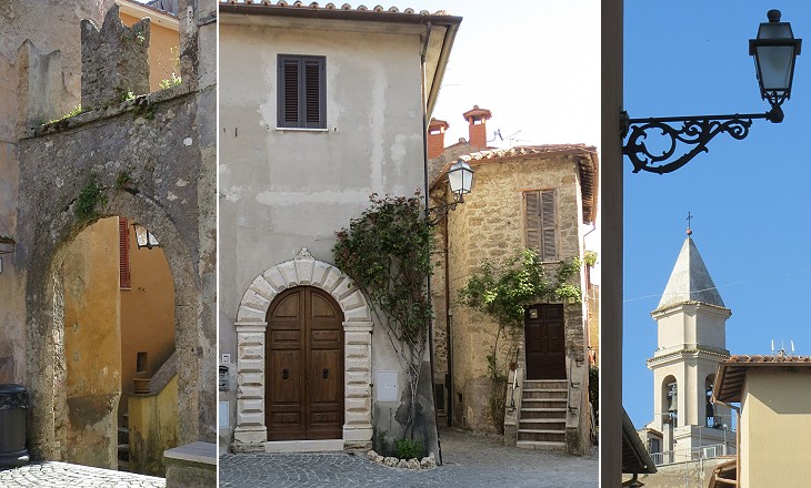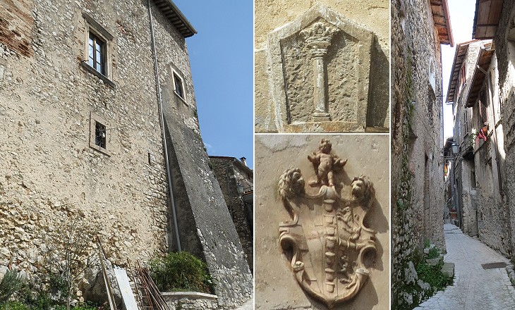(left) Palazzo Baronale (today the building houses a small museum on local farming practices); (centre) coats of arms of the Colonna (above) and of the Massimo (below); (right) a street near Palazzo Baronale