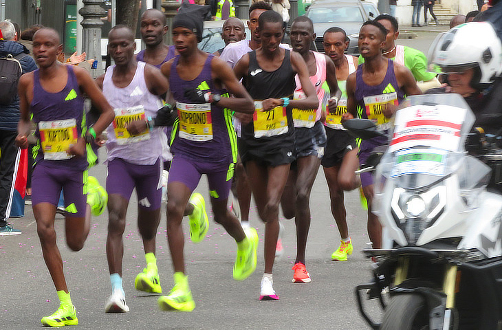 2026 Rome Marathon: front runners at the 3rd km. The winner of the race, Kenyan Asbel Rutto, is portrayed at the far right of the image. He won also the 2024 Rome Marathon