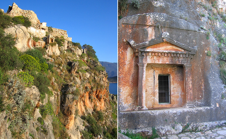 (left) The red rocks under the fortress; (right) Lycian tomb