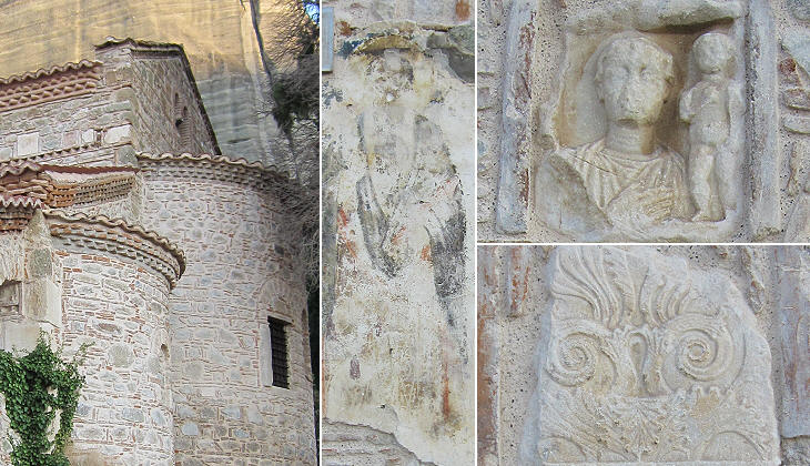 Details of the church: (left) apses; (centre) remaining evidence of frescoes; (right-above) funerary relief; (right-below) decoration of an ancient inscription