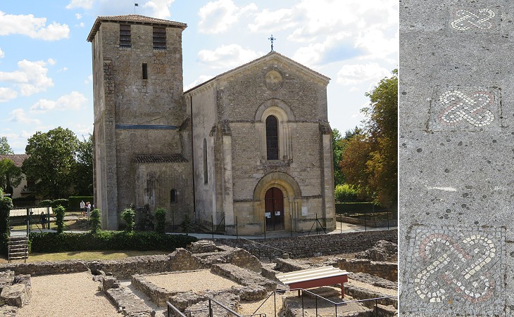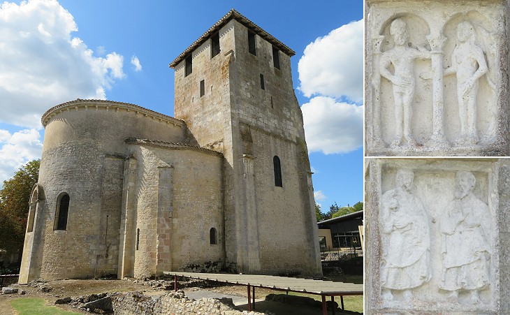 (left) Saint-Pierre-ès-Liens, a Romanesque church on the site of a Roman villa at Montcaret, 20 km east of Saint-Emilion; (right) reliefs portraying Adam and Eve and Saint Peter and Saint Paul