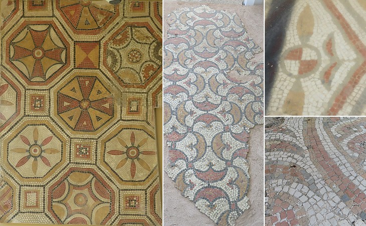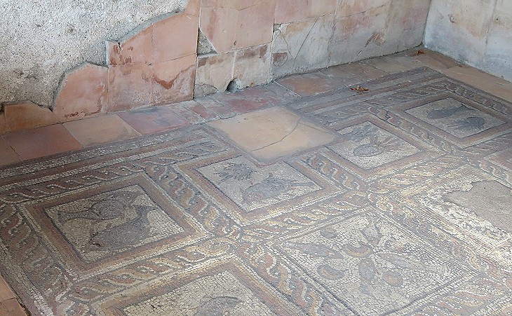 The floor mosaics of the public part of the house are characterized by the use of yellow and red pieces, similar to what can be seen in many other parts of the Roman Empire, e.g. at Villa La Olmeda in Spain and at St. Albans. The feature which strikes the viewer is the absence of emblemata, small sections portraying human beings or animals; these very often had references to the pagan myth (see some emblemata at Villa Adriana); maybe the landlords who lived there in the late IVth century feared that some of their guests could criticize them because they disregarded the efforts by Emperor Theodosius and his successors to stamp out all references to the traditional cults.