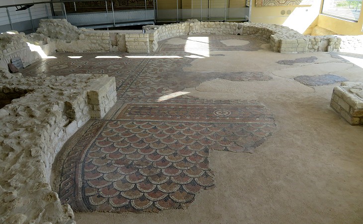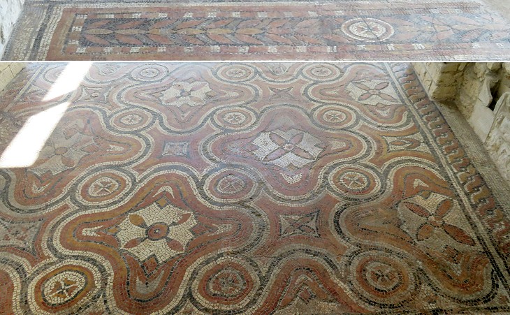 Some of the bath halls and in particular the calidarium (hot room) and the tepidarium (tepid room) lie beneath the church. They were accessed through an entrance which was decorated with a floor mosaic depicting highly unusual lozenges ending with peltas and Solomon's knots.