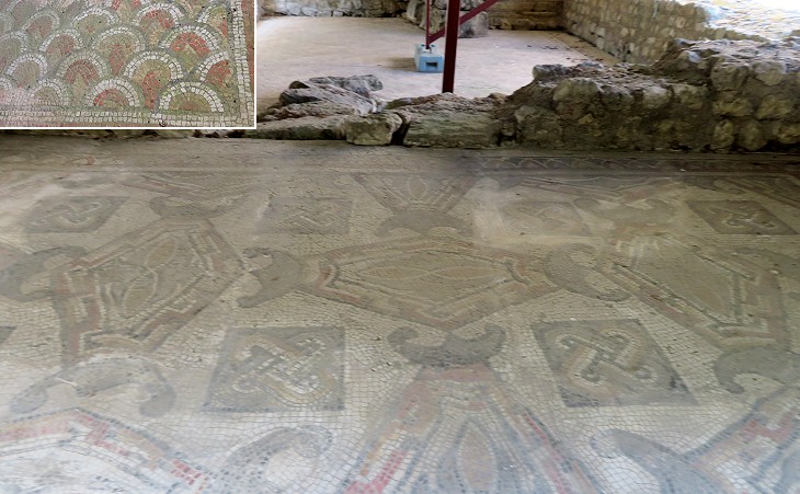 Entrance to the bath halls; (inset) floor mosaic of the adjoining room with a fish scale pattern which can be seen also in the Cruciform Hall