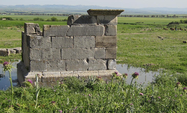 The mausoleum of a family near the Arch to Gordian (you can see them together in the introductory page) was decorated with a long inscription with the names and the ages of those whose ashes were housed inside the small building. From the inscription we learn that the Julii had a good set of genes because one of them reached the age of 91 - V(ixit) A(nnos) LXXXXI - as you can see in the image used as background for this page, a remarkable achievement for that time. You may wish to see the spectacular Mausoleum of the Julii at Glanum in Southern France.