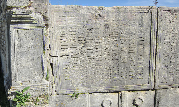 Inscriptions: (left) celebrating Emperor Hadrian; (right) celebrating Emperor Septimius Severus and his wife Iulia Domna. This inscription with other stones taken from temples and other buildings was used by the Byzantines to fortify the Forum in the VIth century