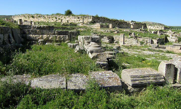 The photo shows the modern road behind the temple which links Tunis to El-Kef. At Musti it follows the route of the Roman one between Carthage and Theveste.