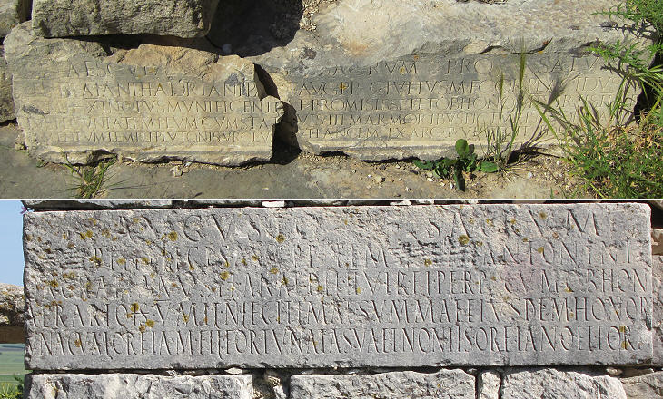 Inscription of benefactors: (above) celebrating improvements to the Temple to Aesculapius and to that of Pluto Urceus which were paid for by C. Iulius Placidus, a "flamen", and which were endorsed by the "decuriones", local magistrates in charge of the administration of the town; (below) celebrating a Temple to Mercury built with money given by L. Nonus Rogatianus Honoratus, another "flamen", and his family at the time of Emperor Macrinus
