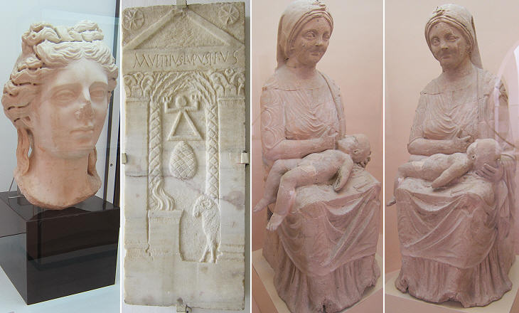 Museum of Nabeul: (left to right) head of a woman found at Domus Nympharum; stela representing a temple to Tanit, a Carthaginian goddess; pottery statue of Nutrix (Ist century AD), a fertility goddess