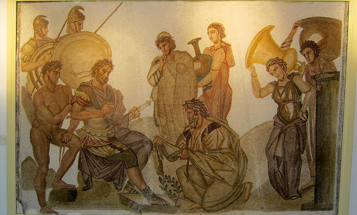 Homer's poems were another source of inspiration for large mosaics. The episode of Chryses pleading for the release of his daughter is described at the very beginning of the Iliad: