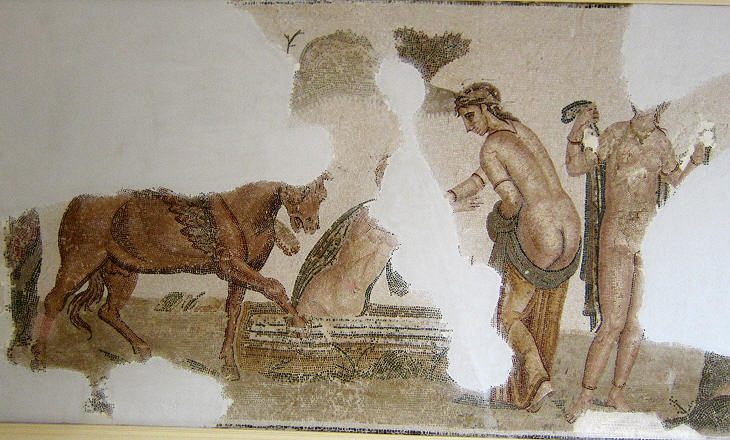 Most of the rooms around the courtyard were paved with large coloured mosaics, some of which have been moved to a small museum in town. They are dated IVth century AD and they show the persistence of subjects related to the Classical World. The mosaic of the Muses bathing in a fountain is a variation on the theme of the Three Graces, which was very popular throughout the whole Roman Empire (see an example at Philippopolis, today's Shahba in Syria). Three Muses, similar to the Graces, were portrayed with one of them turning her back to the viewer.