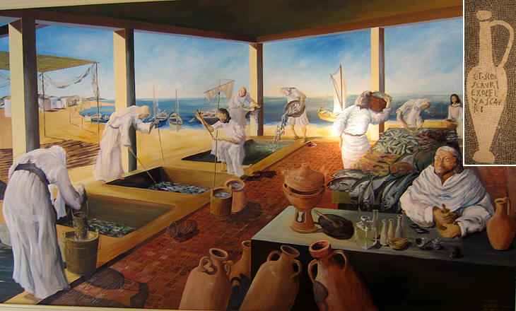 Garum manufacturing explanatory panel; (inset) mosaic depicting a garum pitcher found at Pompeii (according to Pliny the Elder, the town was a garum manufacturing centre)
