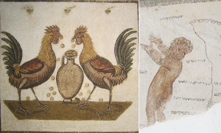Museum of Nabeul: (left) cocks dropping gold coins (from Domus Nympharum); (right) fragment of a mosaic with a marine subject
