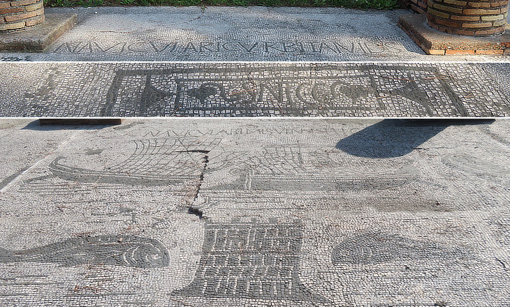 Ostia - Piazzale delle Corporazioni: (above) floor mosaic of "statio 34", the shipping agency of "Curubis", a lost Roman town near Neapolis (SNFCC = S(tatio) N(aviculariorum) F(rumentariorum) C(lassis) C(ommodianae)