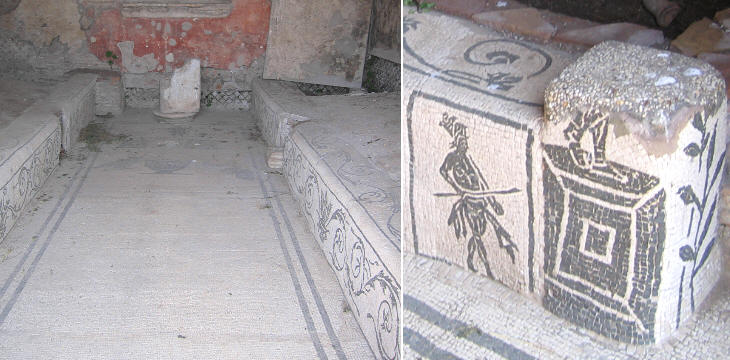 Mitreo delle Sette Porte: (left) overall view; (below) mosaic of the right bench showing Mars and the lower part of Cautes or Cautopates, two torch bearers who were very often depicted in "mithraea"