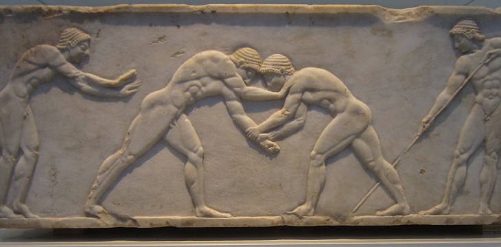 National Archaeological Museum of Athens: detail of a relief of a gravestone found in the Keramikos cemetery: it depicts two "pancratiasts" and a referee with a stick