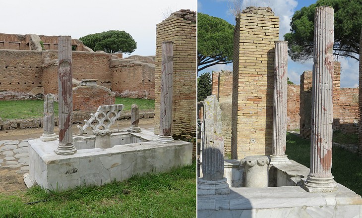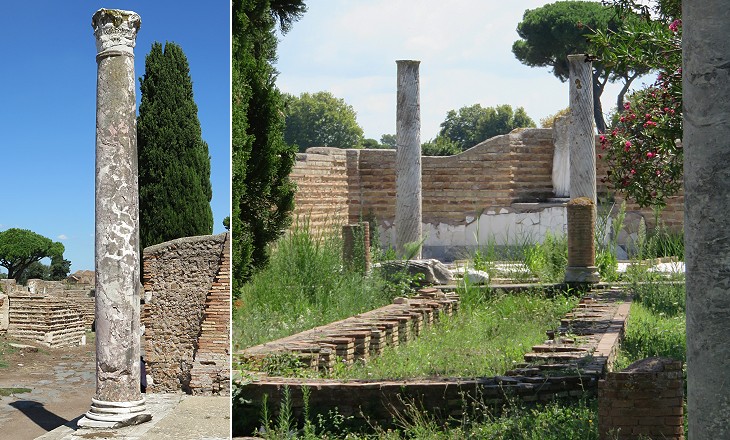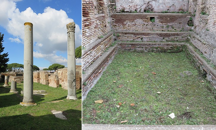 Schola del Traiano: (left) columns at the end of the peristyle; (right) latrine