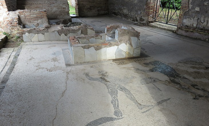 In the early IIIrd century AD a large caupona was installed in a former shop near the site of Porta Marina (which had been razed to the ground in the Ist century AD). It is named after a floor mosaic portraying Alexander and Helix, two "pancratiasts". The tavern had a back room which, because of some puzzling subjects of the floor mosaics, has led some archaeologists to believe it was used for prostitution. You may wish to see a relief from Portus which depicts a tavern scene.
