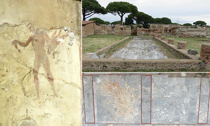 Houses near Terme delle Sei Colonne: (left) fresco in Domus dell'Aquila; (right-above) atrium of Domus di Dioniso; (right-below) marble floor
