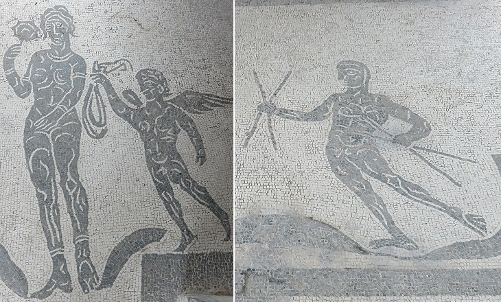 "Caupona" di Alexander e Helix: floor mosaics portraying: (left) Venus and Cupid; (right) a dancer.
