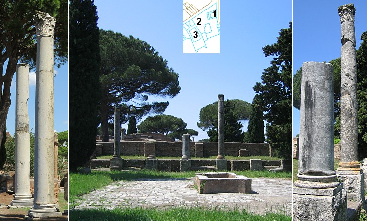 Schola del Traiano: (left) column on Decumanus Maximus; (right) peristyle and a banquet hall behind it