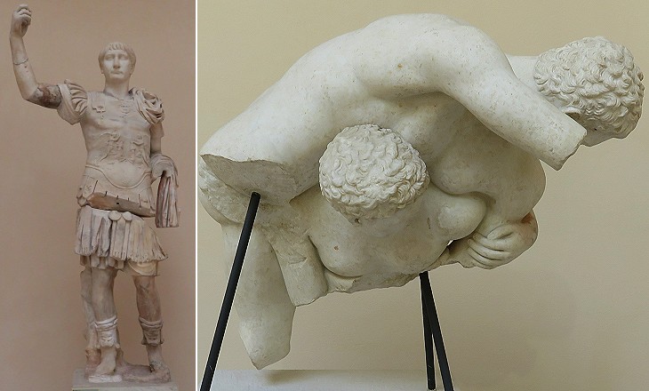 Museo di Ostia Antica: statues found at Schola del Traiano: (left) deified Emperor Trajan; (right) two wrestlers