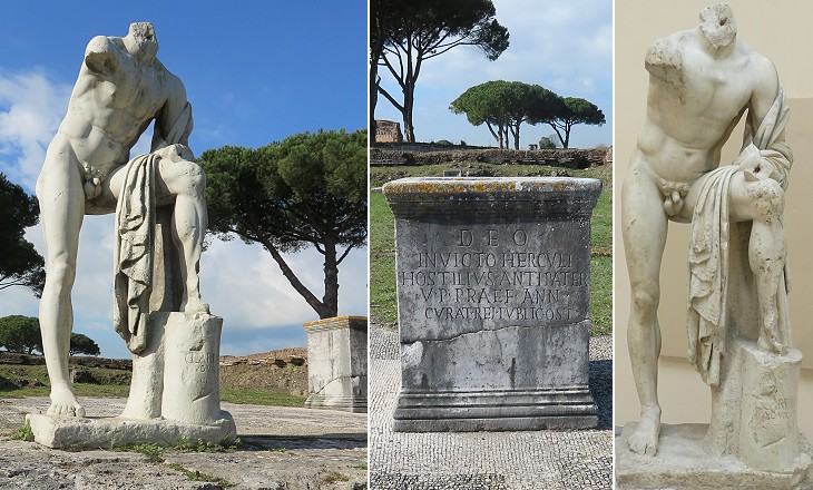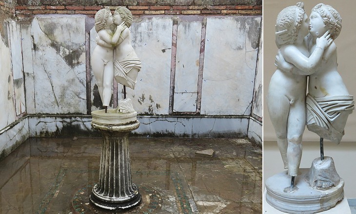 Domus di Amore e Psiche: (left) "cubiculum" (bedroom) where the statue which gave the name to the building was found; (right) original at Museo di Ostia Antica (see a similar statue which was found near S. Balbina)
