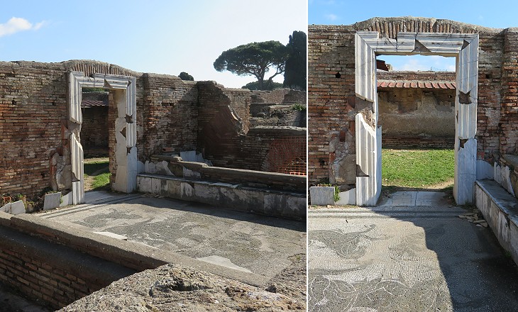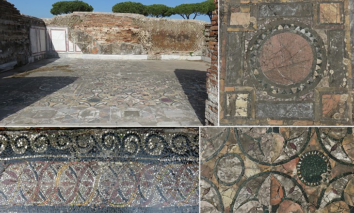 The use of opus sectile, i.e. elaborate marble inlays, became more frequent in the Late Empire, when a number of monuments/buildings were abandoned and fragments of their coloured marble decoration became available. The halls of this domus were decorated with very elegant motifs which can be regarded as forerunners of those developed by the Cosmati family in the XIIth century. A very fine example of house decorated with opus sectile was discovered in 1959 outside Porta Marina.