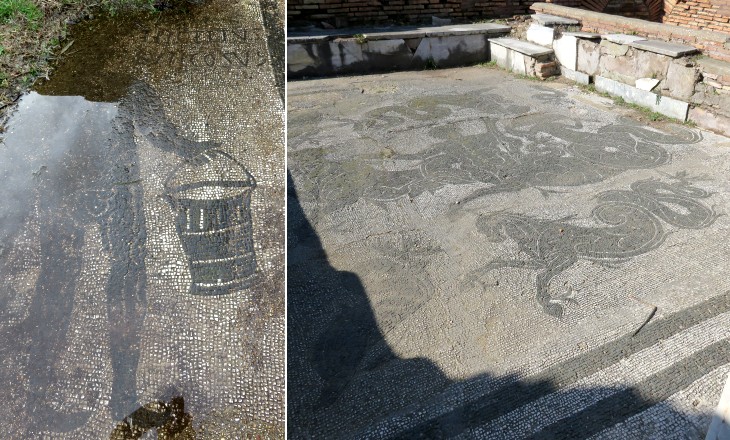 Terme di Buticosus: (left) floor mosaic portraying Buticosus; (right) floor mosaic of the "calidarium"