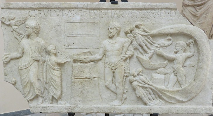 A Ist century BC relief found at the temple suggests that it might have been erected after a statue of Hercules was found by local fishermen in their net. The relief was paid for by a haruspex, a priest in charge of divination. These priests had a temple on the Palatine hill in Rome. The relief indicates that the Hercules worshipped at Ostia gave oracular responses by means of sortes, tablets with a word or a name or just letters which were drawn out of a group. This type of divination was practiced at the Sanctuary of Fortuna Primigenia in Praeneste. Nella buona e nella cattiva sorte is the Italian for "in good and bad times", because It. sorte means fate, destiny.