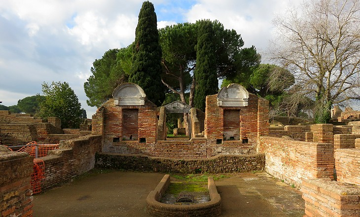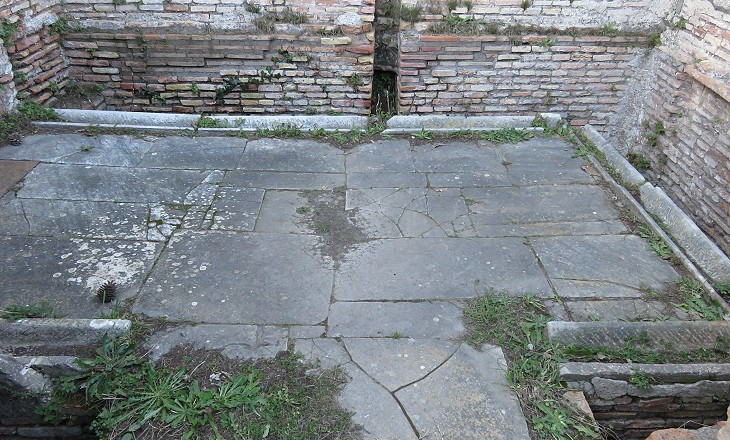 Terme del Filosofo along Semita dei Cippi were named after Plotinus, a IIIrd century AD philosopher of whom two busts were found in the building, most likely in a section which was not part of the bath establishment. The latter was opened in the IIIrd century in a unit of the insula (block) which had been used for other purposes. The large latrine shown above had direct access from the street and it might have existed before the baths were built (of these only some bare walls remain).