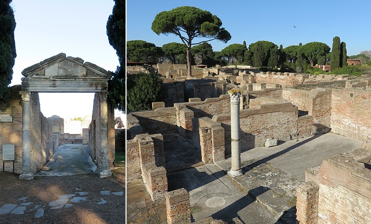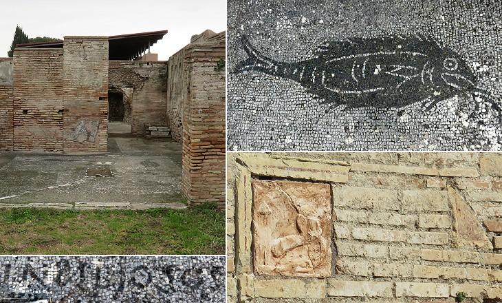 Domus della Fortuna Annonaria: (left) niche in the courtyard with a statue of Diana; (centre) marble decoration of the walls; (right) latrine