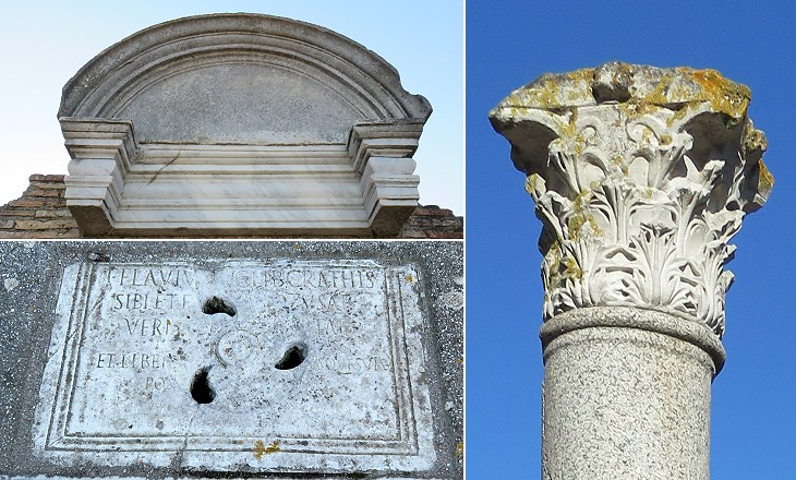 Domus del Protiro: (left-above) entablature and tympanum of a nymphaeum niche; (left-below) funerary inscription, reused as drainage lid; (right) marble capital on top of a granite column